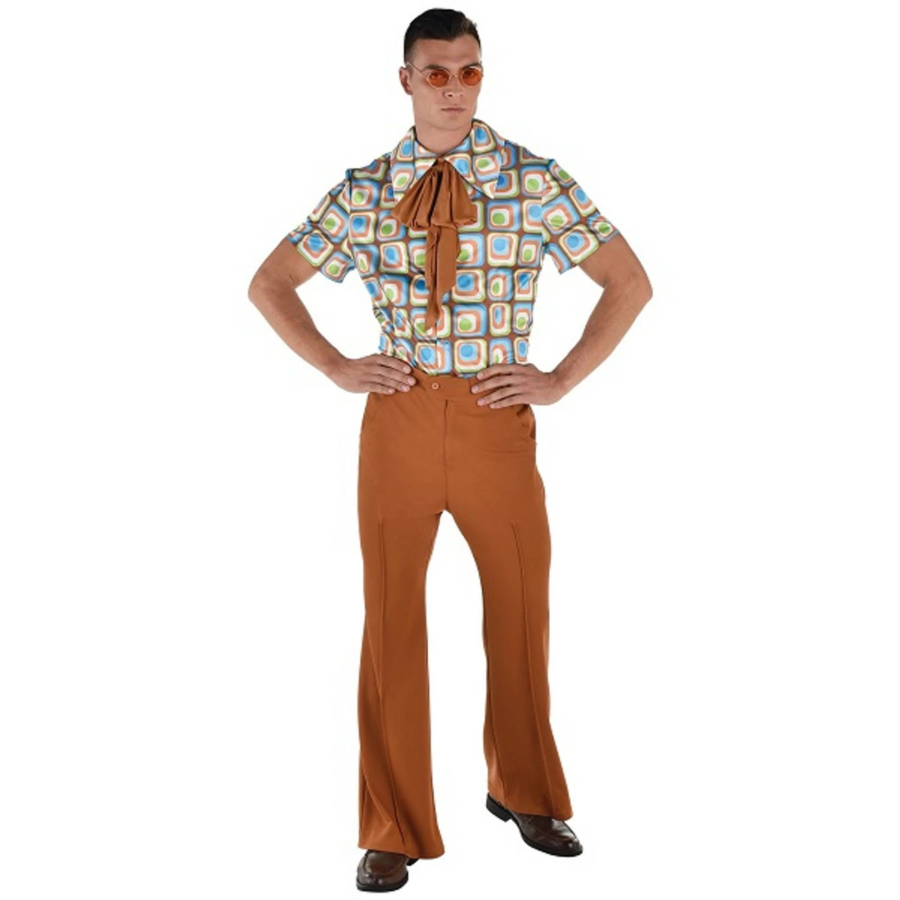 Get ready to make a statement with this 60’s Collared Shirt & Pants Set! This set features a colorful shirt with burnt orange pants and matching ascot. Shoes and sunglasses not included. Small/Medium fits up to men’s size 42, Large/X-Large fits up to size 46, and Plus Size fits up to size 52.