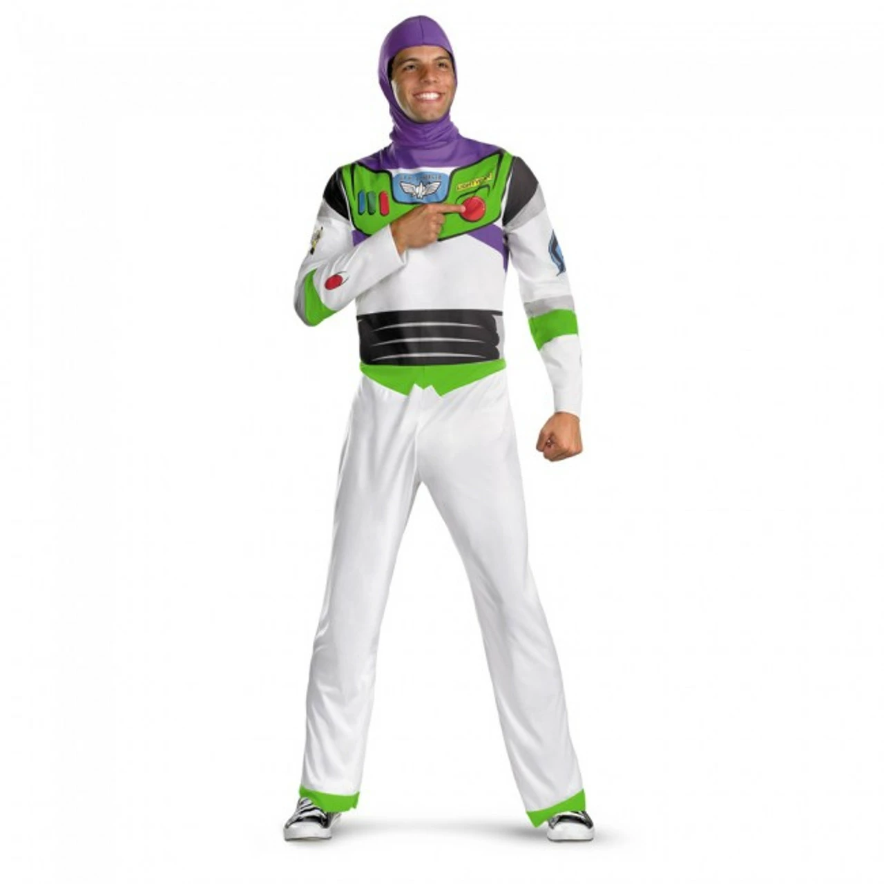 Become your favorite Toy Story space ranger for Halloween with this Adult Buzz Lightyear costume! Includes green and white jumpsuit and a purple character hood. Shoes not included.