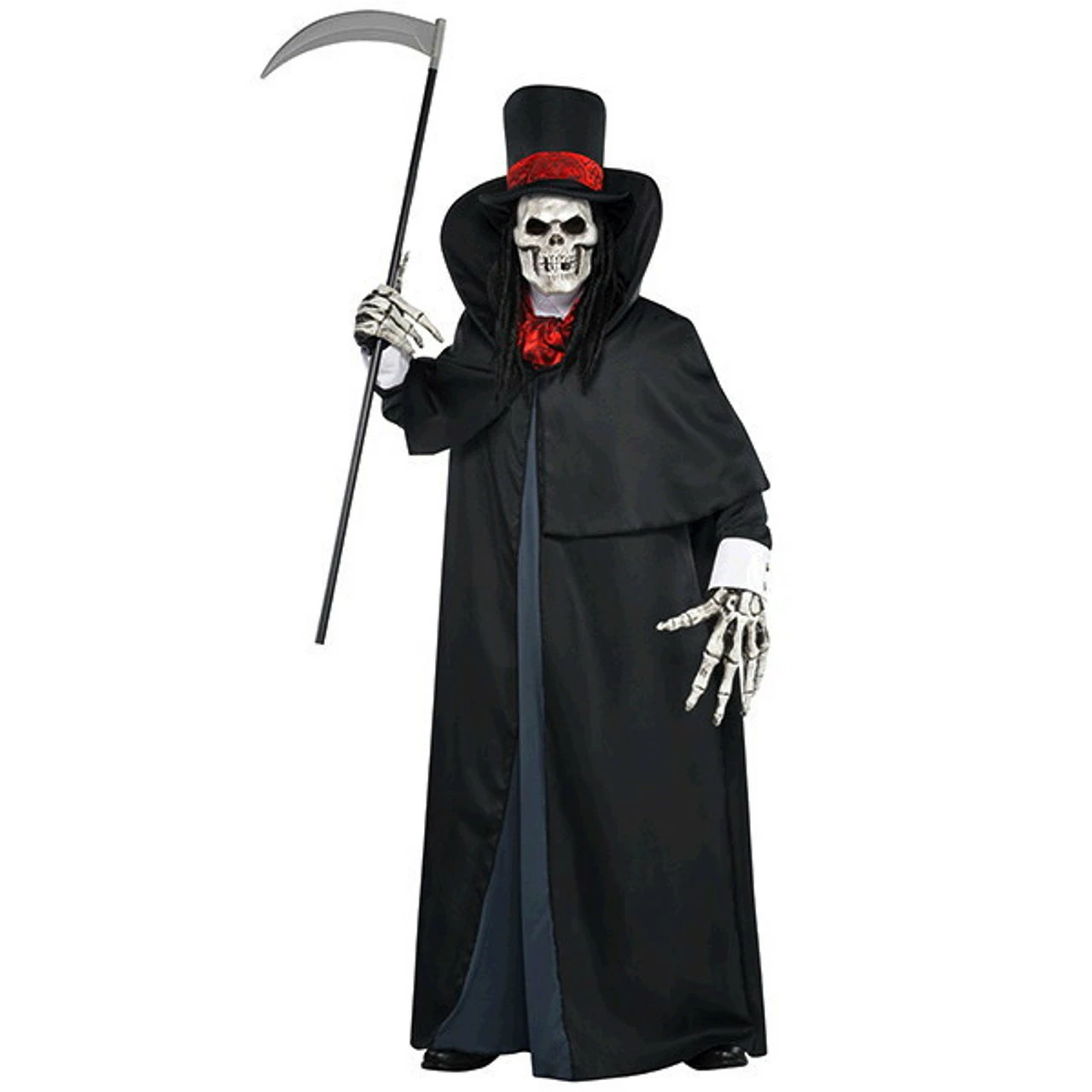 Turn into a scary character for Halloween with this Adult Dapper Death costume! This costume features a cape, hat with attached hair, mask, mock shirt, ascot, and gloves. Toy weapon and shoes not included. Standard fits up to menÂ’s size 42 and Plus fits 48 – 52.