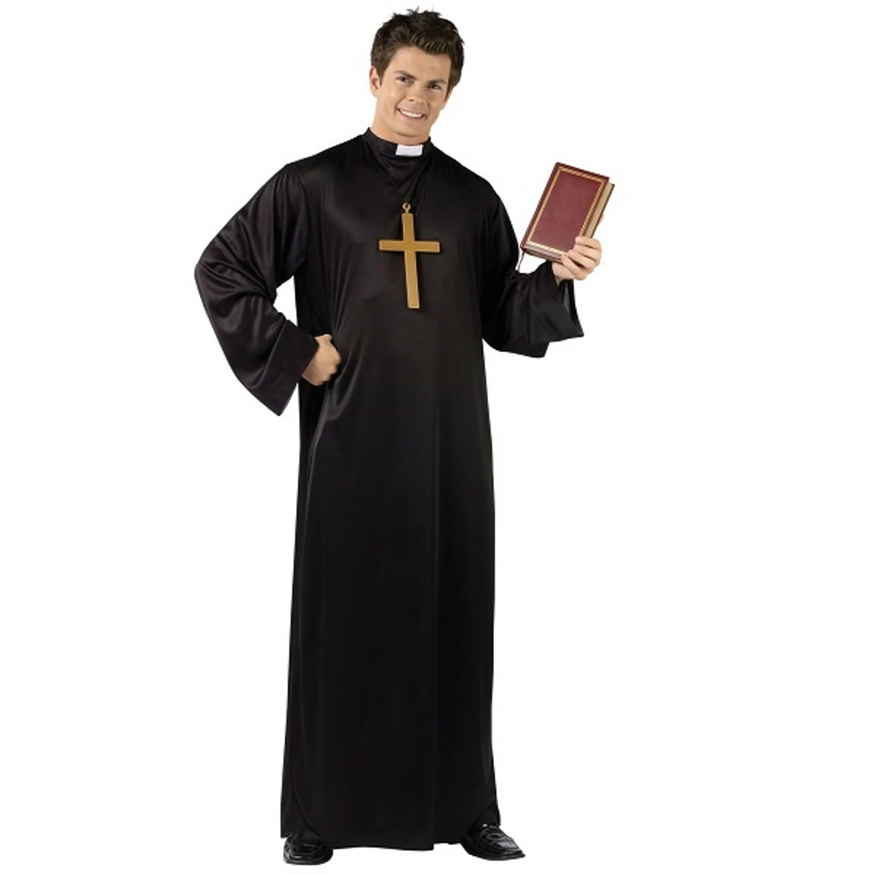 Become a holy man for Halloween with this Adult Priest costume! This costume features a robe with attached collar and belt. Cross necklace, bible, and shoes not included. One size fits most up to 6ft, 200lbs.