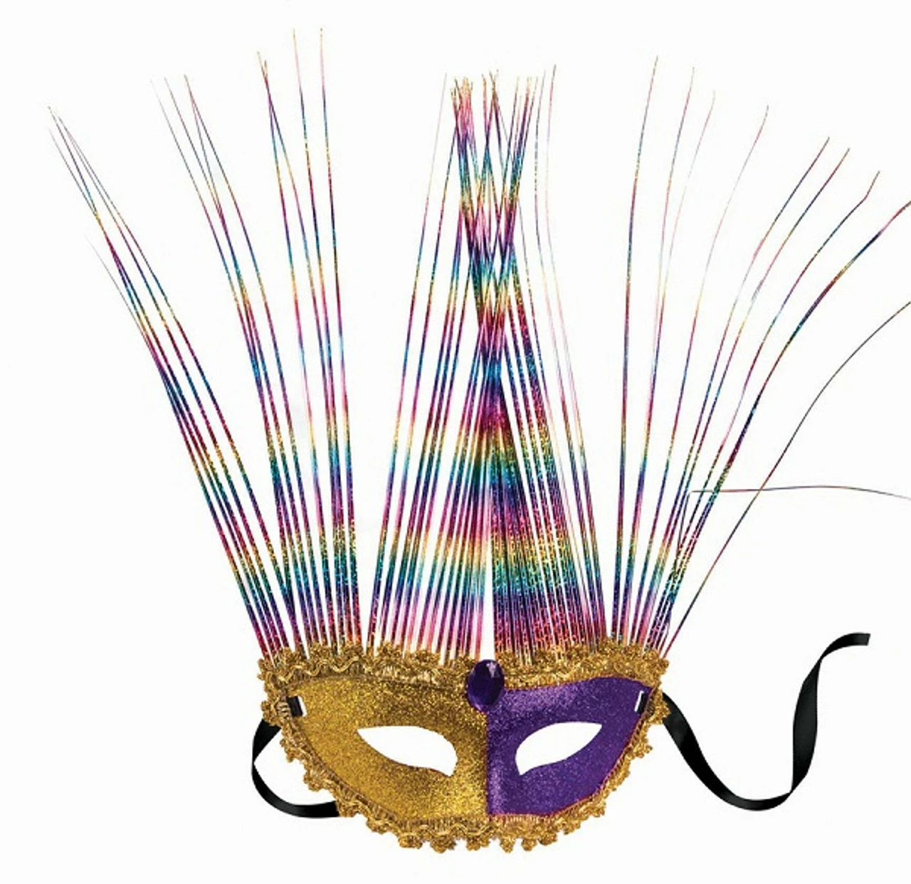 YouÂ’re sure to get attention when you wear this Colorful Spray Half Mask! This eye mask features gold and purple glitter with metallic gold rope trim, attached rainbow sprays, and black tie ribbons. One size fits most.