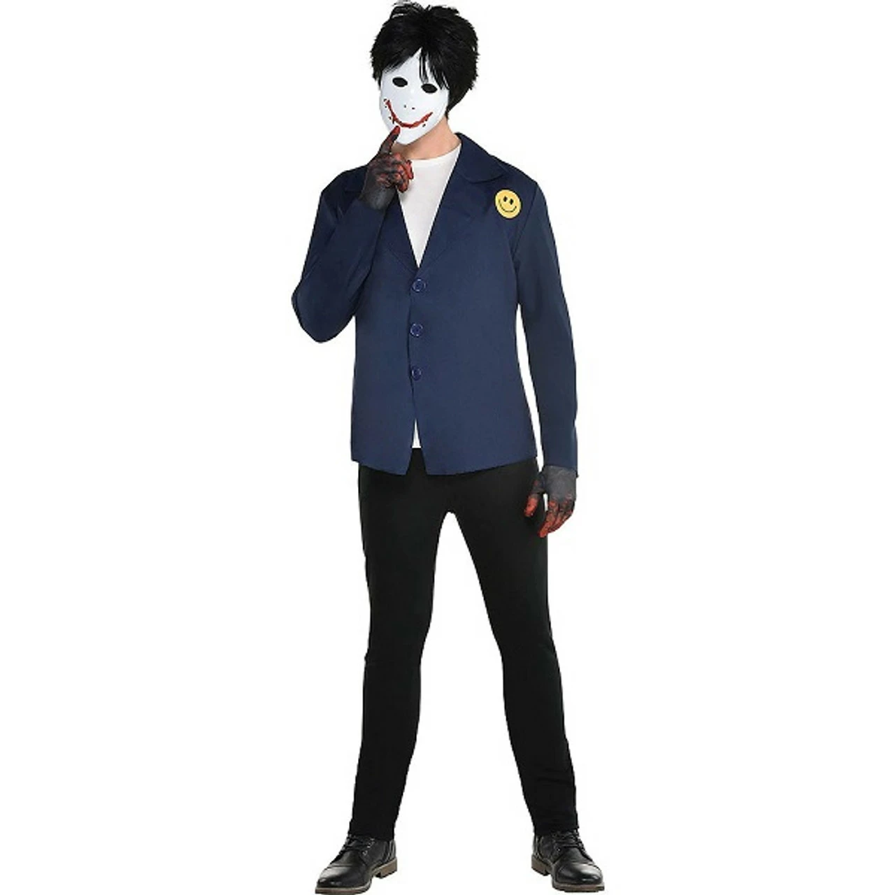 Transform into a menacing looking artist with this Creepy Painter Man costume! This costume features a navy blue jacket with a printed smiley face, a black wig, bloody smile face mask, and black and red gloves. Pants, shoes, and shirt not included. Adult Standard fits up to chest size 42 and Adult Plus fits up to chest size 52.