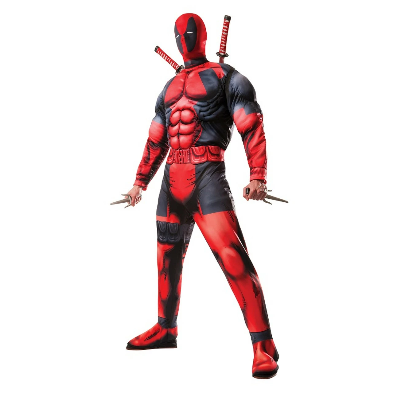 Transform yourself into your favorite wise-cracking vigilante for Halloween with this Deluxe Deadpool costume! Includes fiber filled muscle chest jumpsuit with padded arms and velcro tabs and face mask with mesh eye-coverings. Accessories not included. X-Small fits up to 34 chest Standard fits up to 44 chest X-Large fits up 44 – 46 chest
