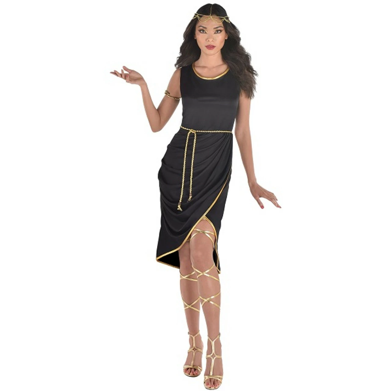 Become a Nile Queen for Halloween in this Egyptian Dress! This svelte black dress features metallic gold detailing and includes a matching belt. Headpiece, jewelry, and shoes not included. One size fits most up to womenÂ’s size 12.