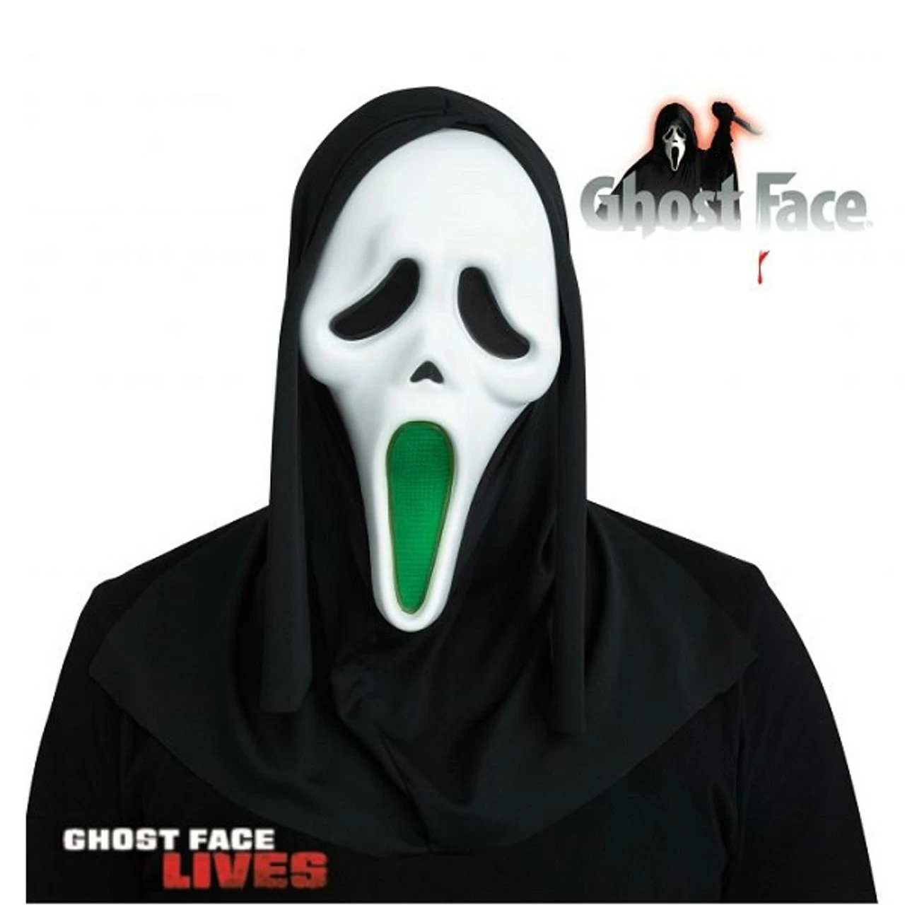 Add a new look to your Scream inspired costume with this Fade Mouth Ghost Face Mask! This over the head mask features a Ghost Face with a mouth that lights up and has a fade effect attached to a black fabric hood. Batteries included. One size fits most adults and older teens.