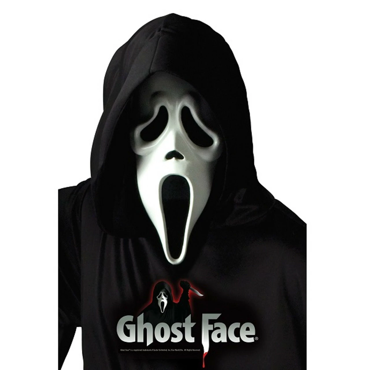 Transform into the creepy killer form the movie Scream with this Ghost Face Mask! This vinyl face mask features eye and nose holes and an attached black shroud. One size fits most adults and older teens.