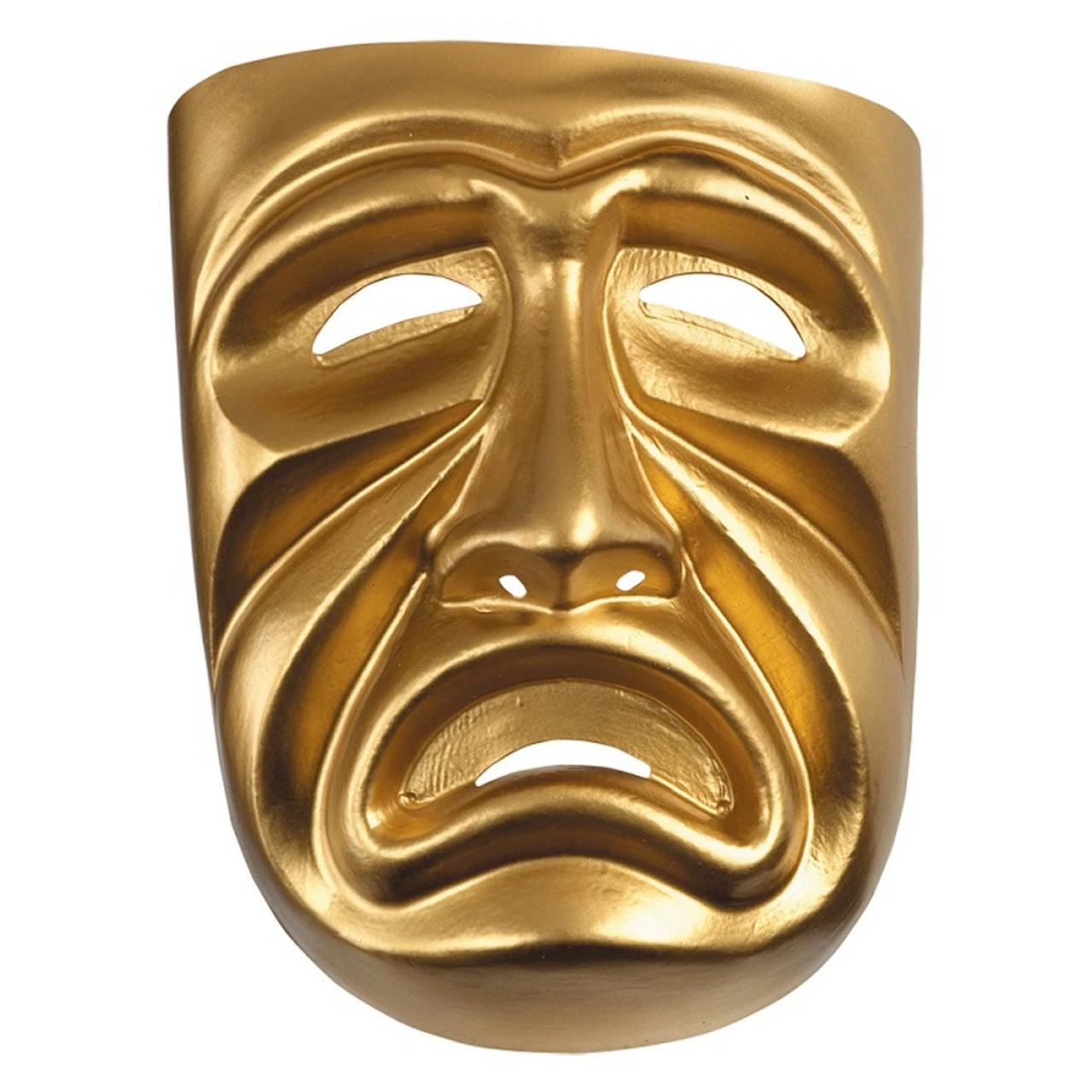 Let your drama show when you wear this Gold Tragedy Mask! This gold, plastic mask features classic dramatic tragedy features with sad eyes and mouth and an elastic head string. One size fits most.