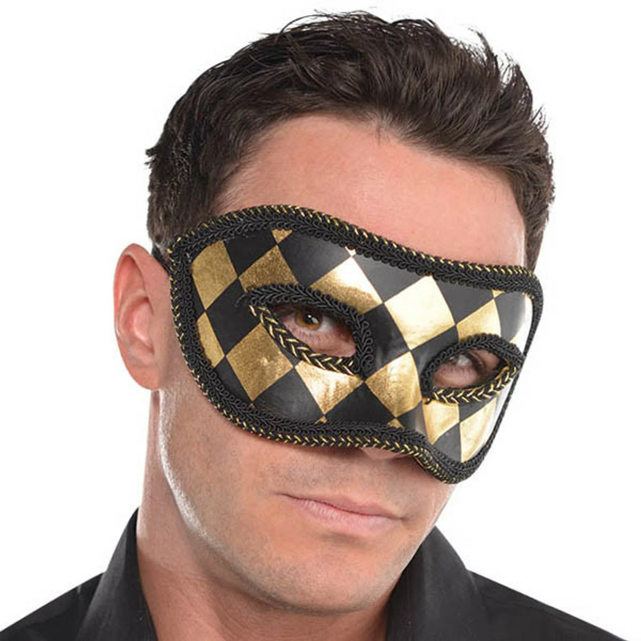 Keep your identity a mystery with this Harlequin Black & Gold Mask! This plastic eye mask features a gorgeous black and gold harlequin diamond pattern, braided rope trim, and an elastic band. One size fits most.