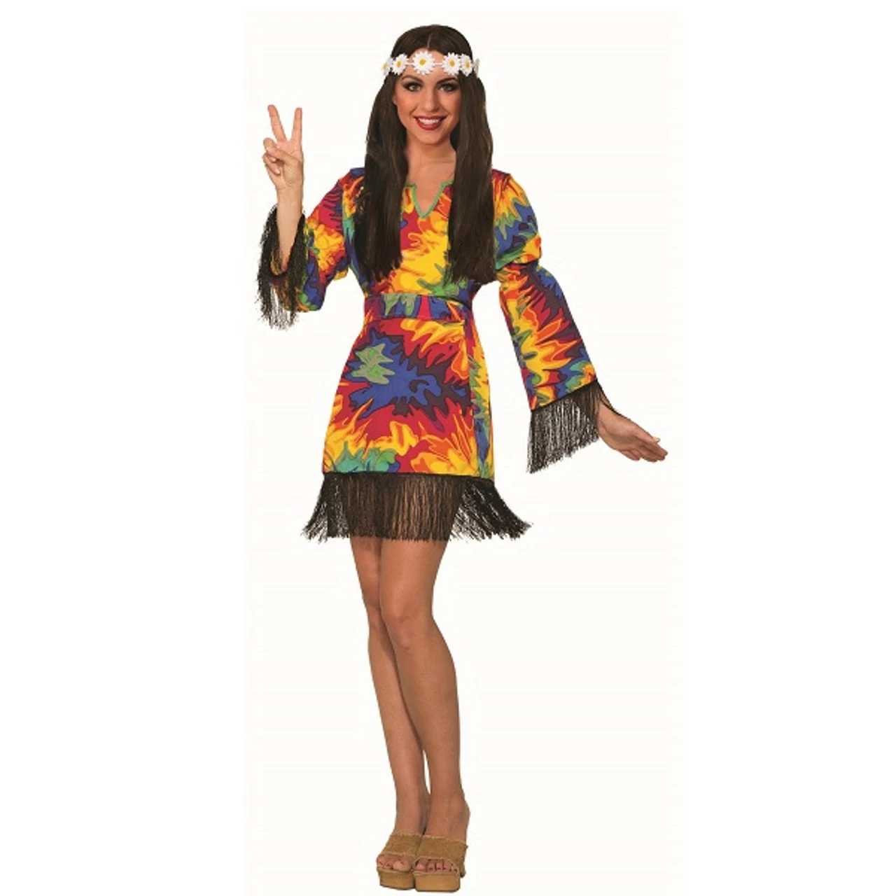 Release your inner 60’s girl when you wear this Hippie Tie Dye Dress! This cute dress features a colorful tie dye look with long fringed sleeves and fringe trim and includes a matching fabric belt. Additional accessories not included. Adult Standard fits most women up to size 14/16 Plus size fits 18 – 22