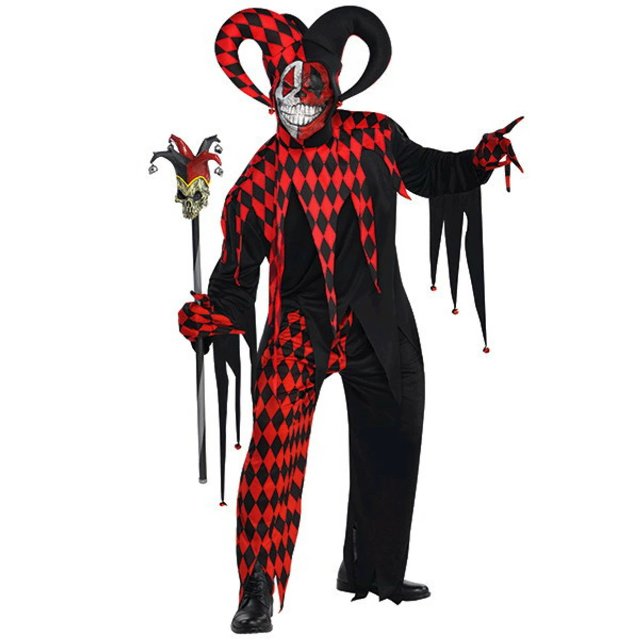 Get ready to scare the trick-or-treaters when you wear this creepy Krazed Jester costume! This costume features a shirt, headpiece, mask, gloves, and pants. Staff and shoes not includes. One size fits most menÂ’s sizes up to 42.