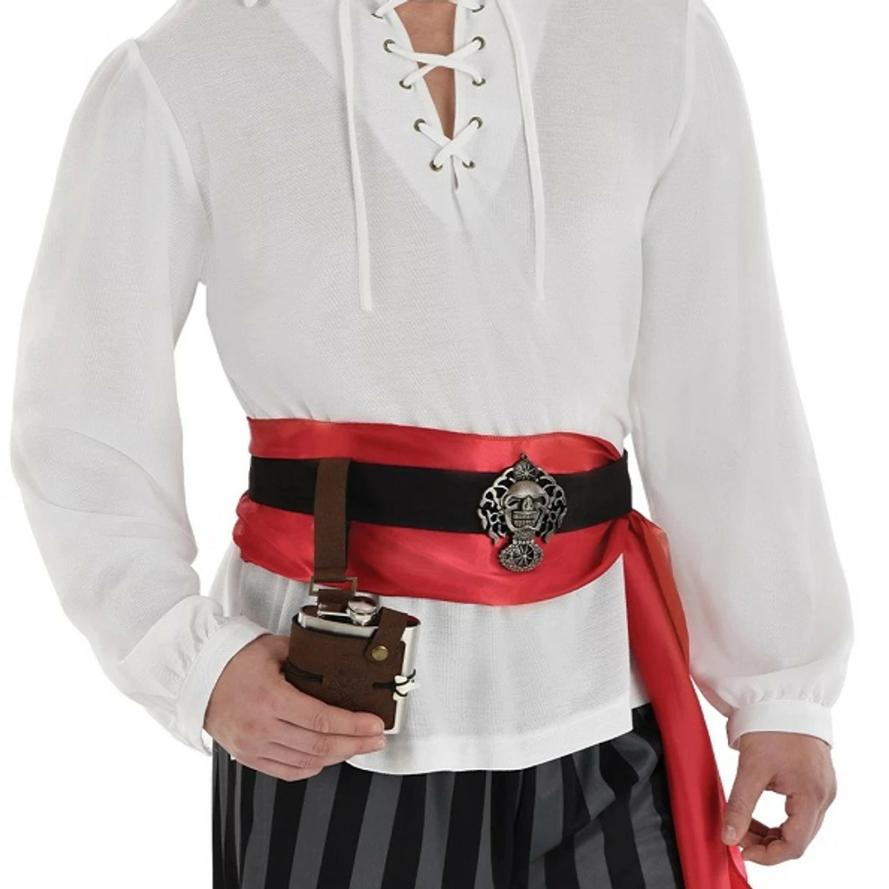 Carry your favorite spirits with you in this Pirate Belt Flask! This silver metal flask features a brown faux suede holster with an attached belt loop and an elastic with faux shark tooth closure. Flask measures 3.7in x 3.7in and holds up to 6oz.