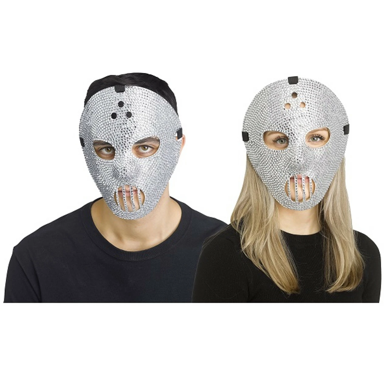 Glam up your gore maker costume with this Rhinestone Hockey Mask! This plastic mask features a classic hockey mask design with a rhinestone finish. One size fits most adults and older teens.