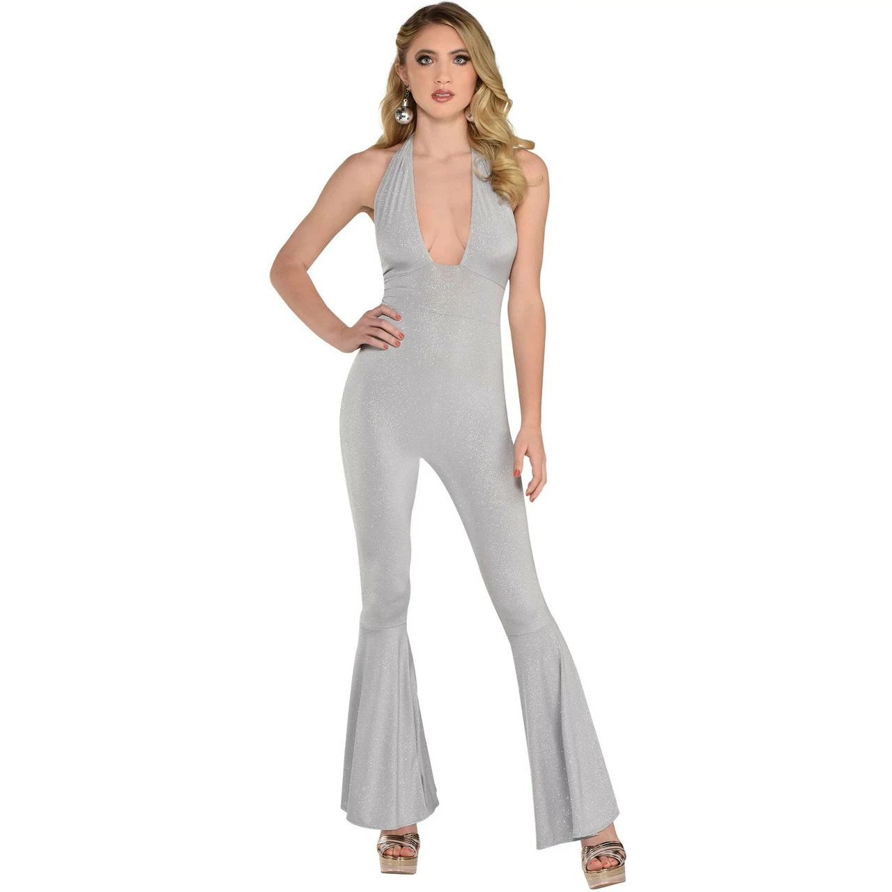 Get ready to hit the dance floor in this sparkling Silver Disco Jumpsuit! Shoes and microphone prop not included. Small/Medium fits up to women’s size 8, Large/X-Large fits up to size 16, and Plus fits 18 – 20.