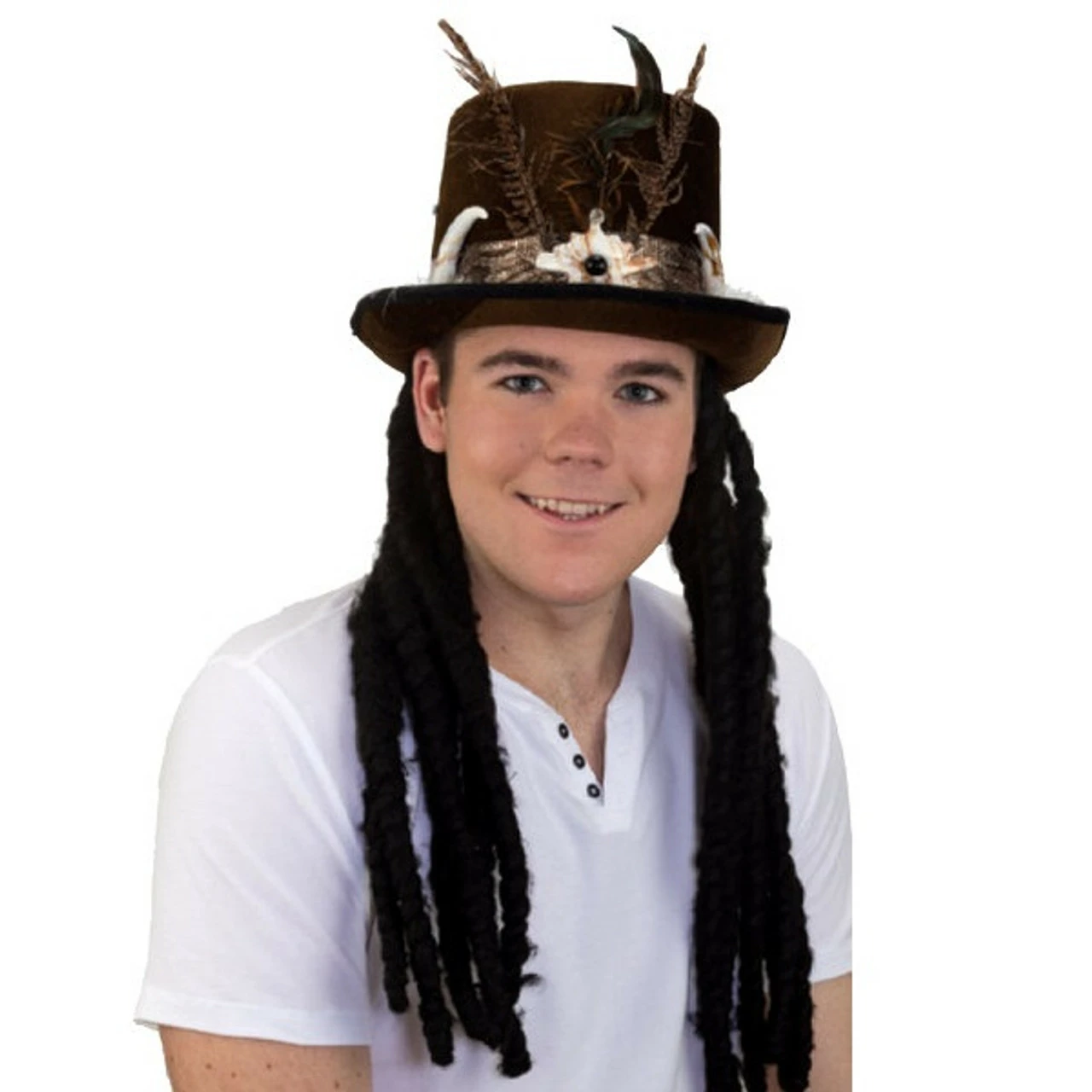 Practice your voodoo that you do when you wear this Witch Doctor Dreadlock Hat! This brown top hat features assorted feather, plastic bone, and white marabou accents with long black yarn dreadlocks. One size fits most. *Shirt not included
